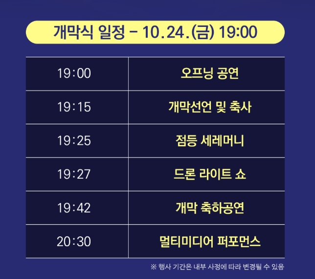 - 개막식 오프닝 공연, 점등 세레머니, 드론 라이트쇼, DJ 퍼포먼스 등 화려한 이벤트
